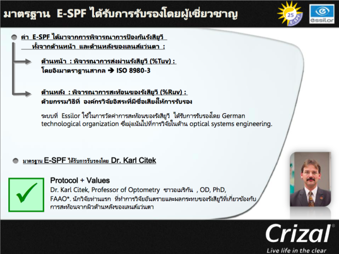 วิธีการนับค่าE-SPF (EYE-SUN PROTECTION FACTOR)ที่ลูกค้าหลายท่านจนถึงผู้ประกอบการยันพนักงานขายสงสัย มันคือการวัดประสิทธิภาพของการป้องกันUVจากทั้งสองด้านของเลนส์ จริงๆมันเป็นการนับรวมการป้องกันเเสงจากทุกทาง ซึ่งมันก็ต้องคำนึงถึงกรอบกันด้วยนะครับ ดูโครงสร้างกรอบเเละสรีระกับการใช้งาน จริงๆเเล้วกรอบเเว่นสายตามันก็ใช่ว่าจะใช้เเทนเเว่นกันเเดดไปเลยได้ เพราะมุมโอบในการป้องกันเเสงหรือเเม้กระทั่งความกว้างความใหญ่มันก็ไม่ได้เท่าเเว่นกันแดด