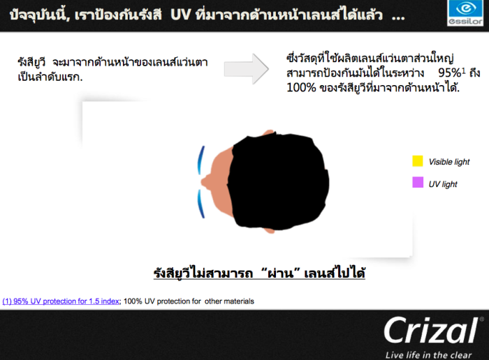 คือโดยปกติเลนส์ส่วนใหญ่ก็ป้องกันเเสงที่ผ่านจากด้านหน้ามาได้อยู่เเล้วเเทบทุกค่าย เเต่ถ้านับจากวัสดุเนื้อเลนส์index1.5จะป้องกันการส่งผ่านของUVได้ราวๆ95% วัสดุอื่นๆที่indexสูงกว่า1.5จะอยู่ประมาณ100%