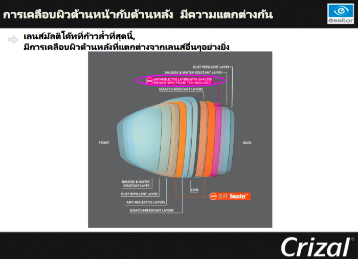 เเละด้วยLAYERการเคลือบผิวที่ด้านหน้าเเละด้านหลังของCRIZALFORTE UV มีประสิทธิภาพที่สามารถลดเเสงสะท้อนกลับจากรังสี UVได้ดีที่สุด