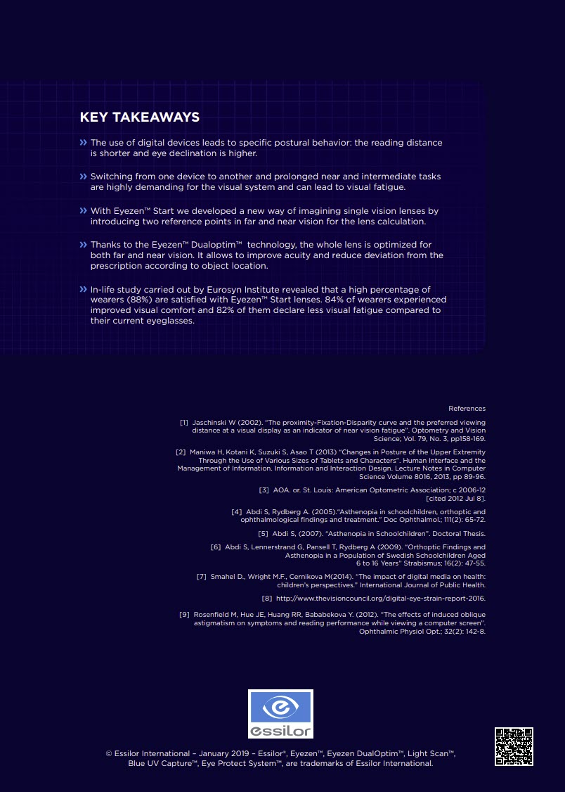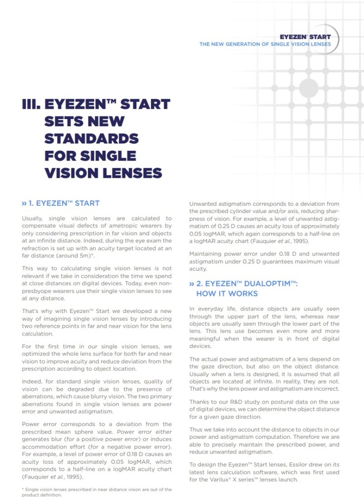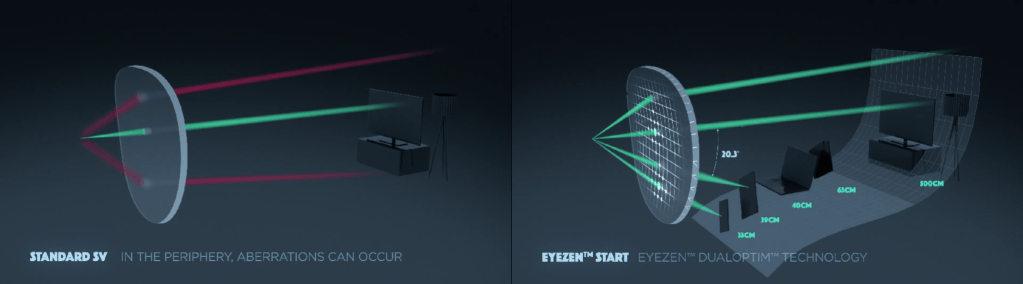 eyezen start ไม่ใช่เลนส์โปรเกรสซีพ หรือเลนส์กลุ่ม young presbyope เเต่มันคือเลนส์ชั้นเดียวที่ค่าสายตามันนิ่งในเเกนการใช้งานของผู้ใช้อุปกรณ์อิเลคทรอนิค