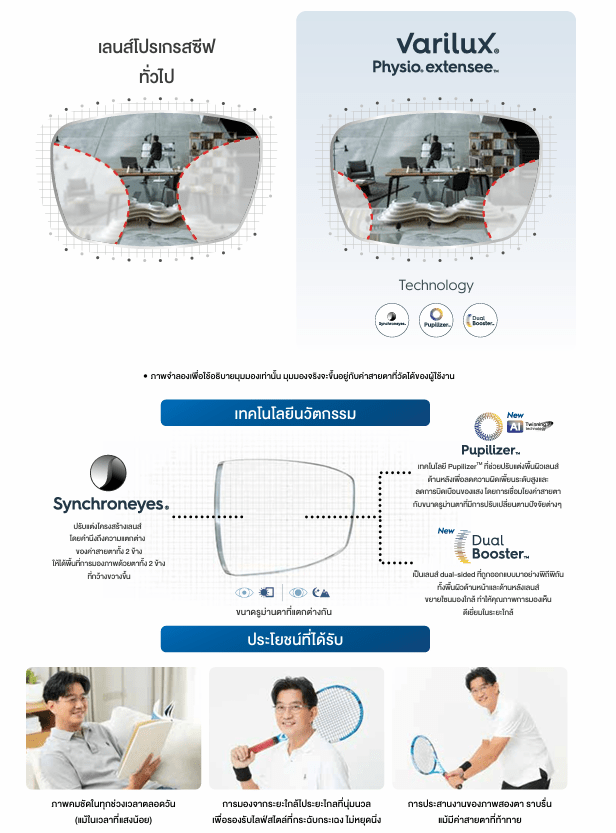 เทคโนโลยีที่อยู่เบื้องหลังเลนส์โปรเกรสซีฟแต่ละรุ่นเป็นสิ่งที่ช่วยเพิ่มคุณภาพของภาพ ความสบายตา และการตอบสนองต่อการเคลื่อนไหว นี่คือเทคโนโลยีสำคัญของ Physio.extensee และ XR Series